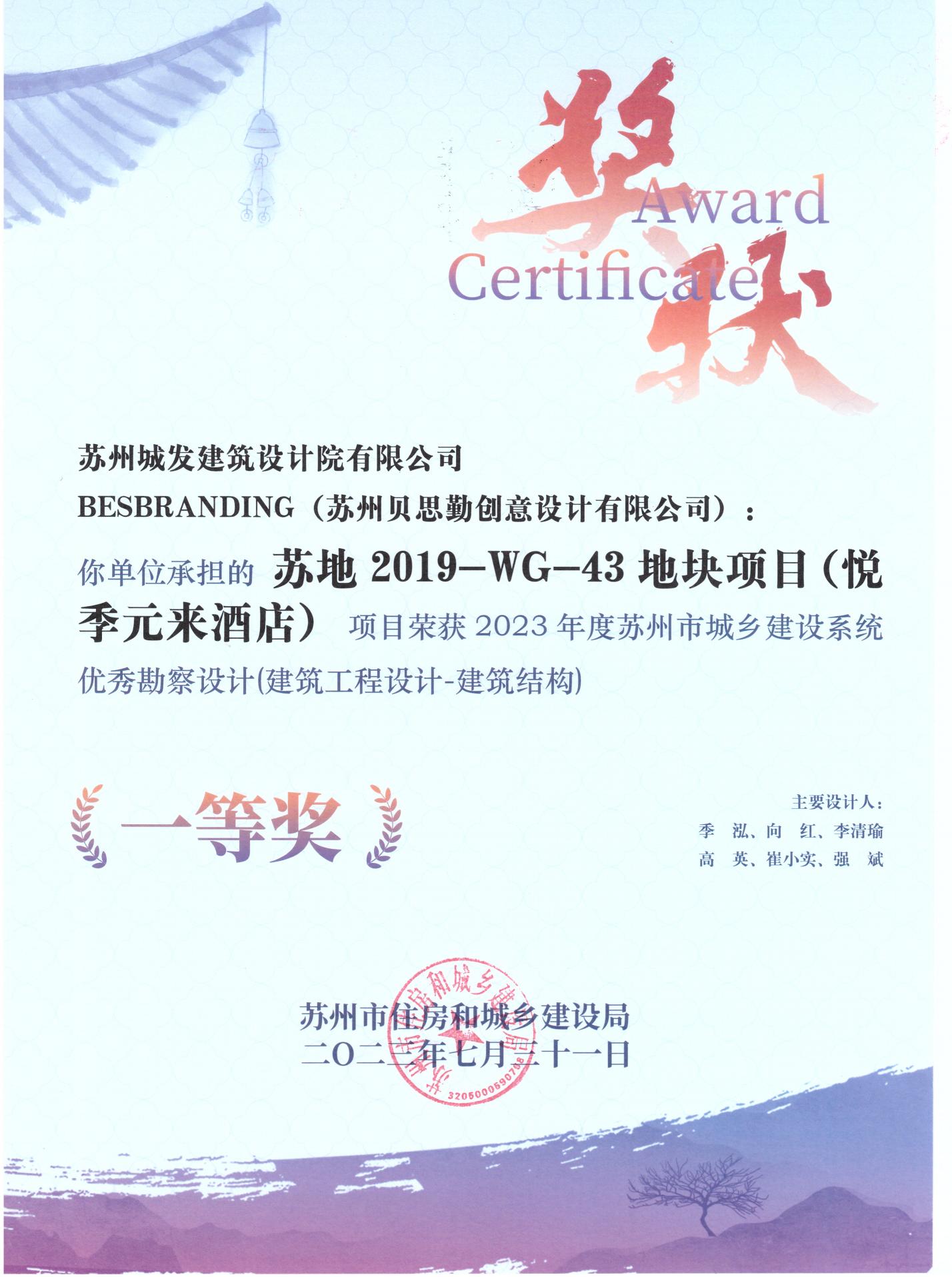 2023年度蘇州市城鄉(xiāng)建設(shè)系統(tǒng)優(yōu)秀勘察設(shè)計(jì)(建筑結(jié)構(gòu))一等獎(jiǎng)